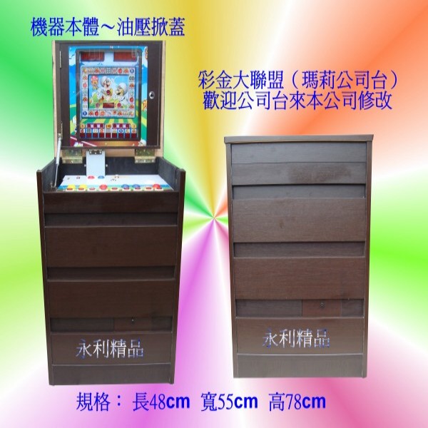 內容介紹 油壓掀蓋式-超級大聯盟 (瑪莉台)電子遊戲機2007的全新機種 不定時贈送樂透對獎電子遊戲機另有中全燈獎拉彩金可直接移分比倍可對7遊戲火車時時開 電子遊戲機 開 洗 投 退功能具全 電玩機率穩定 調整容易 大獎時時開 電玩玩家猶如中大樂透 打發時間 娛樂兼具 電子遊戲機是店家必備投資理財 發財生財的賺錢 電玩遊戲機